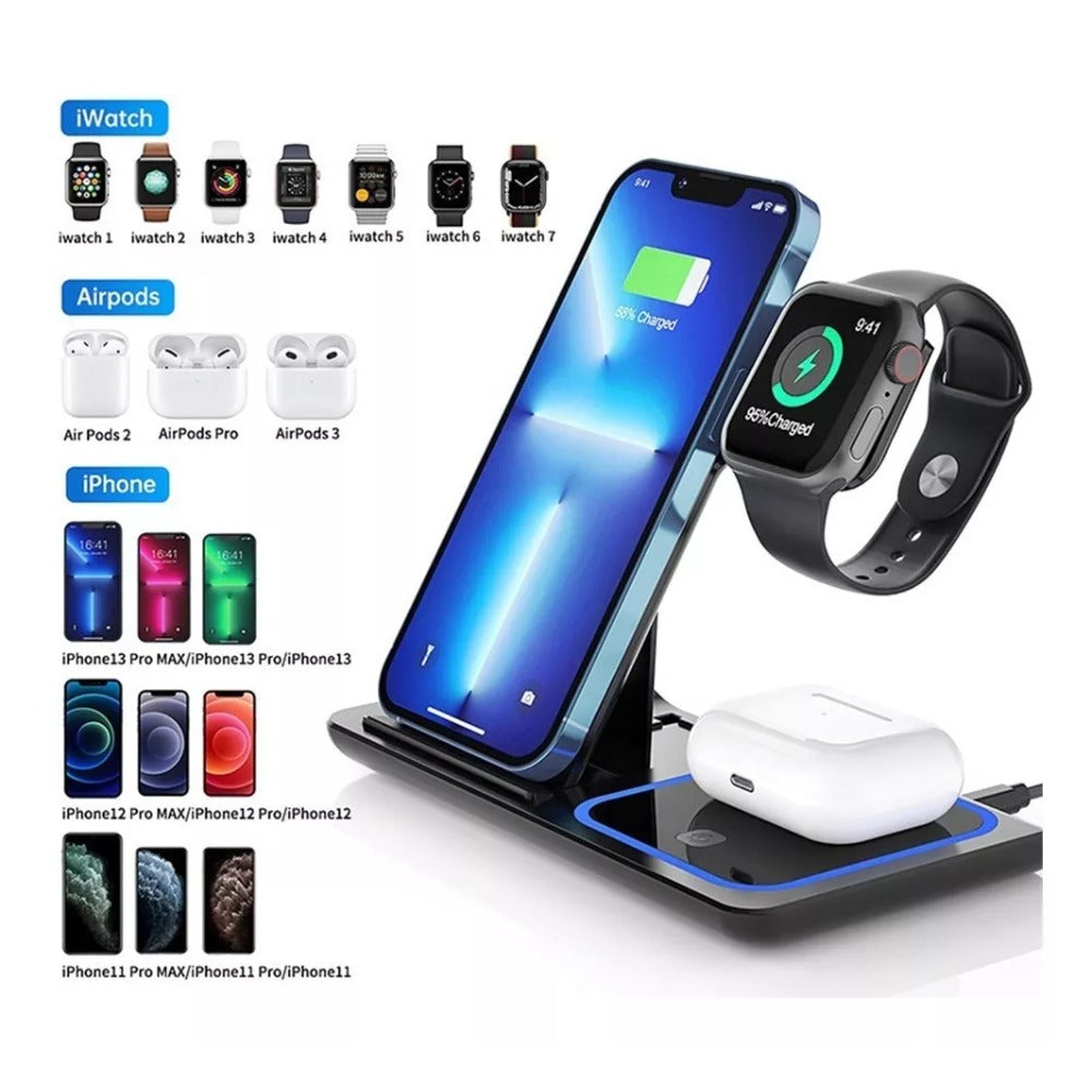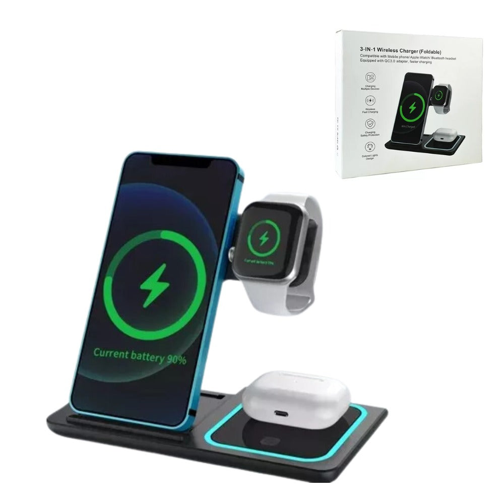 Despídete del desorden de cables con este cargador inalámbrico 3 en 1, ideal para cargar al mismo tiempo tu smartphone, smartwatch y auriculares. Su diseño plegable y elegante lo hace perfecto para escritorios, mesas de noche o llevar de viaje.