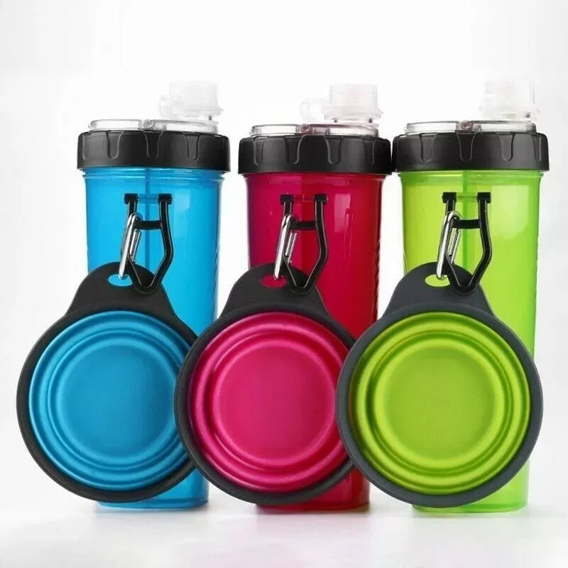 Esta botella multifuncional cuenta con dos compartimientos separados para agua y alimento, además de un tazón plegable incluido que se acopla al envase para mayor comodidad.